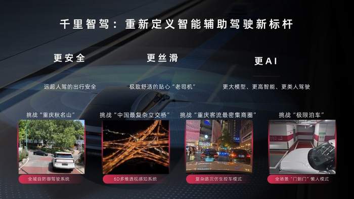 在智能驾驶 领域,智驾系统正进入由AI大模型驱动的发展阶段。千里科技正在基于先进的AI技术,重新定义智能辅助驾驶的行业标杆。本次发布会重点呈现的“千里走8D”实景挑战,选择了以急弯陡坡闻名的歌乐山,国内结构最复杂的盘龙立交桥,人流密集的解放碑商圈,以及极限地下停车库进行实测。面对苛刻的路况,千里智能辅助驾驶系统以更安全、更丝滑、更AI的智能辅助驾驶体验,成功通过了挑战。